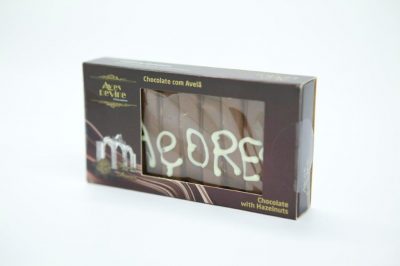 Caixa com tablete de chocolate de leite com avelã